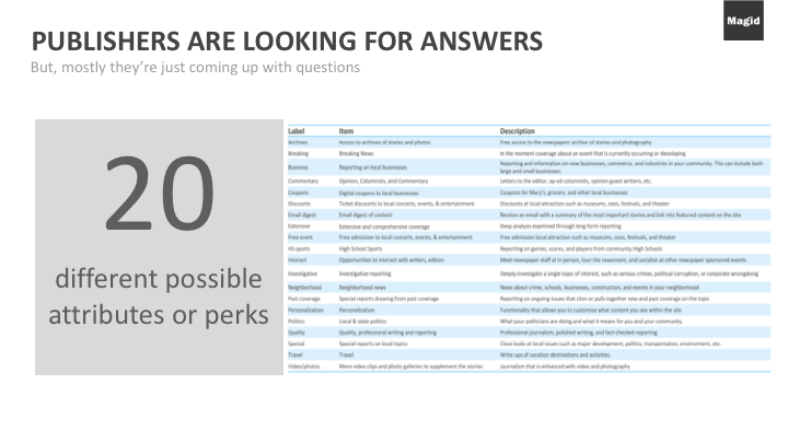 Magid research shows that there is significant opportunity for local newspapers who are willing to rethink the way they design and deliver their editorial content. We recently tested 20 different possible enhancements to grow local engagement with newspapers – everything from coupons, to gift cards, to exclusive access to columnists.