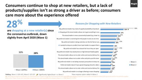 As to why consumers were shopping at different retailers, Magid observed that “a lack of products/supplies isn’t as strong a driver as before; consumers care more about the experience offered.” Indeed, from the first wave of the study, in early April, this motivation had declined from 46% to 32%. Reasons given by shoppers for shopping elsewhere included one-stop shopping (27%), convenient location (23%) and lower prices (17%).