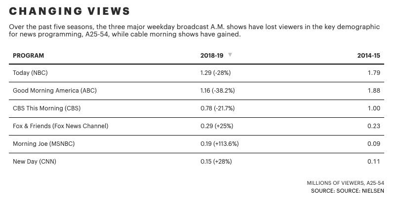 Adding to the tension: Key viewers have defected from the a.m. offerings on ABC, NBC and CBS. Over a five-season period that ended with the 2018-19 cycle, the audience that news advertisers pay for most — people between 25 and 54 — fell almost 22% at “CBS This Morning,” 28% at “Today” and a little over 38% at “GMA,” according to Nielsen. Meanwhile, cable’s best-known morning programs — “Fox & Friends,” “Morning Joe” and “New Day” — have won viewers by aggressively focusing on a narrower political spectrum and breaking national news.