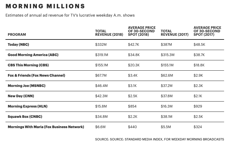 America’s six most-watched morning programs — “GMA,” “Today,” “CBS This Morning,” “Fox & Friends” “Morning Joe” and “New Day” — bring in almost $1 billion in ad dollars and millions of viewers every year. At broadcast networks, the shows typically carry the entire news division. “Today” is “the beating heart, financially, spiritually and editorially,” of NBC News, says Noah Oppenheim, the division’s president. “Yeah, it’s critical.”