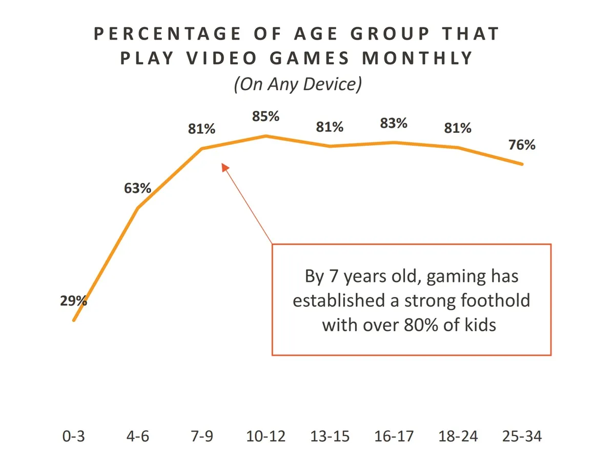 Fortey said, “It starts to ramp up pretty early on in life, with 29% of those ages zero to three playing. I have a four-year old and she plays a lot of a lot of games on her tablet. It just ramps up very quickly. By the time kids are about seven years old, it’s almost at parity with the incidence of people who are playing games at older ages. So around that 80% mark of people who are playing video games.”