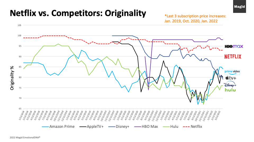 Netflix has also shown a steady decline in eDNA’s Originality dimension scores. More specifically, perceptions of shows and movies that score high for Imaginative and Intelligent attributes (those that greatly contribute to Originality) have been surpassed by content on HBO Max. This all-time low in Originality denotes a symptom of a larger issue for Netflix: the bar is high for quality content – a bar that was initially set by this very streaming platform.