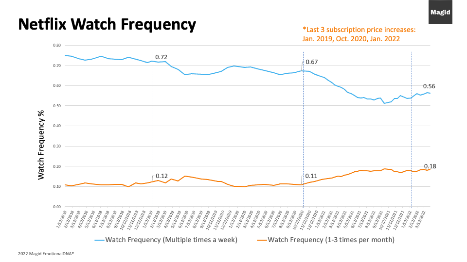 Taking a look at eDNA’s watch frequency metric for Netflix over the past four years, while noting the past few price increases, it is not surprising to see that the percentage of eDNA respondents who say they watch Netflix multiple times a week has seen a steady decline, while the segment of casual viewers (who watch it 1-3 times per month) is seeing growth.
